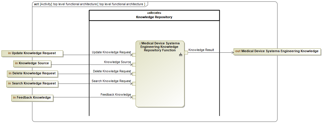 This section details the functional architecture of the Medical Device Systems Engineering Knowledge Repository (MDSE-KR) utilizing SysML diagrams. The functional architecture establishes the foundation for further system design, detailing the essential functionalities to achieve the desired system behavior.