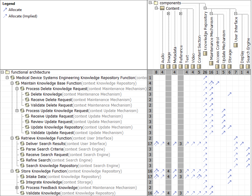 Figure 14.3 is SysML allocation matrix that illustrates how elements in one part of a system relate to elements in another part. In the context of the MDSE-KR, the matrix shows how the system’s functionalities (rows) are allocated to specific physical components (columns).