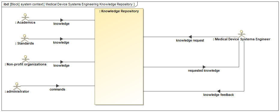 Knowledge Request: This flow shows the request for knowledge from a medical device systems engineer to the knowledge repository.