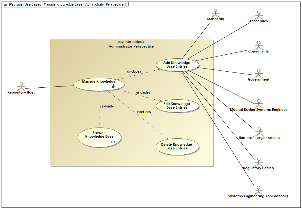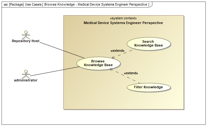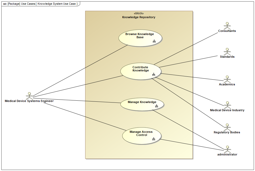 - Medical Device Systems Engineer: This primary actor interacts with the system for browsing, searching, contributing, and updating knowledge relevant to medical device engineering.