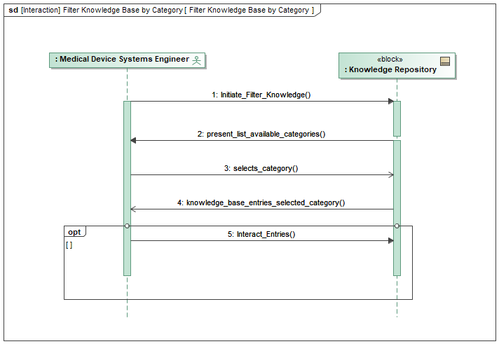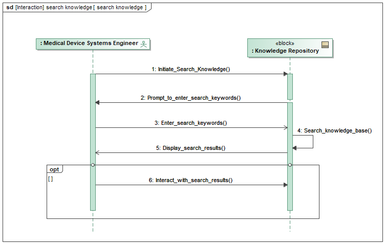 This section analyzes a SysML sequence diagram representing the interaction between a medical device systems engineer and a knowledge repository system. Figure 12.5 depicts the knowledge retrieval process crucial for informed systems engineering within the medical device development domain.