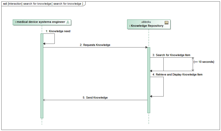 This SysML sequence diagram offers a simplified yet insightful representation of a critical interaction within the medical device development process. Efficient access to relevant knowledge empowers engineers to make informed decisions concerning design, development, and regulatory compliance. The time constraint on the search operation underscores the importance of a well-structured and indexed knowledge repository, facilitating rapid retrieval of necessary information.