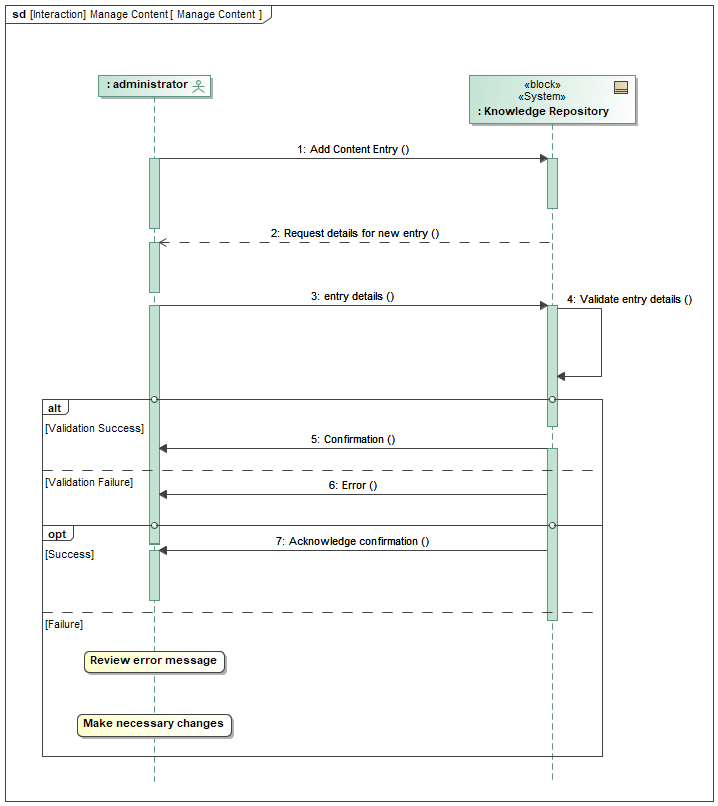 Figure 12.9 is a SysML sequence diagram that focuses on the use case, “Manage Knowledge,” identified in Figure 12.4 from the Administrator Perspective. It illustrates the interaction between the Administrator and the MDSE-KR System for adding a new content entry.