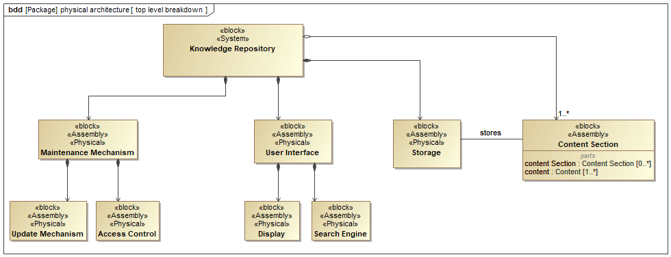 The core element of the system is the Knowledge Repository block. This block represents a database or information storage system that houses the medical device systems engineering knowledge. The system stores multiple Content Section elements, indicated by the notation “[1..*]”. This multiplicity signifies that the repository must contain at least one content section element, and the number of content section elements can be limitless. The content would likely encompasses details about regulatory, risk management, requirements management, and other relevant medical device systems engineering information.