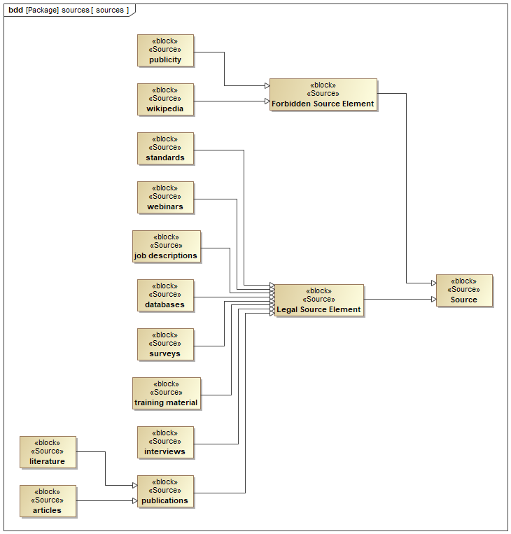 The inclusion of “Forbidden Source Element” highlights the importance of a critical evaluation when selecting information sources. Reliable and verifiable sources like publications, standards, and legal databases should be prioritized for designing the knowledge repository.