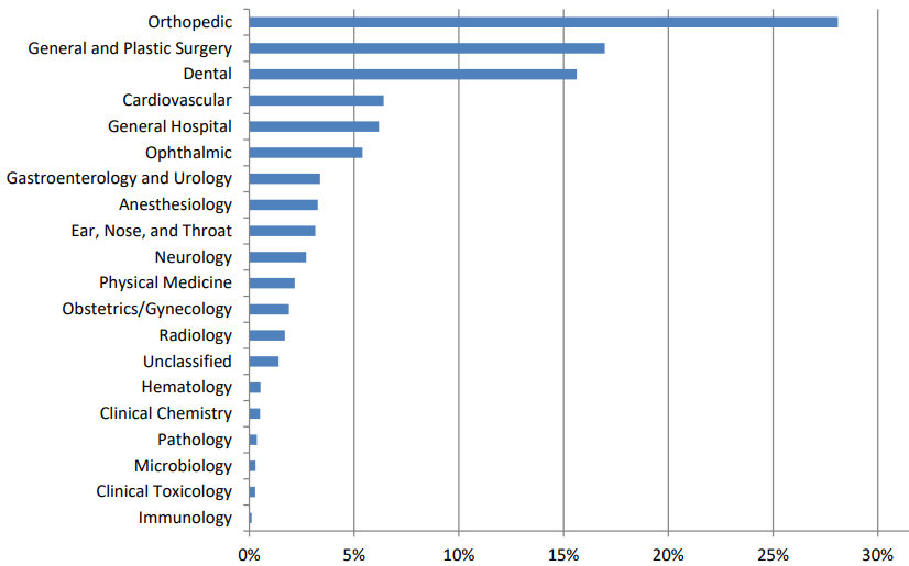 The number of devices registered in a particular specialty doesn’t necessarily reflect the number of procedures performed in that specialty. For example, there may be a relatively small number of complex orthopedic devices compared to the number of simple bandages used in wound care, but both would be classified under orthopedic devices.