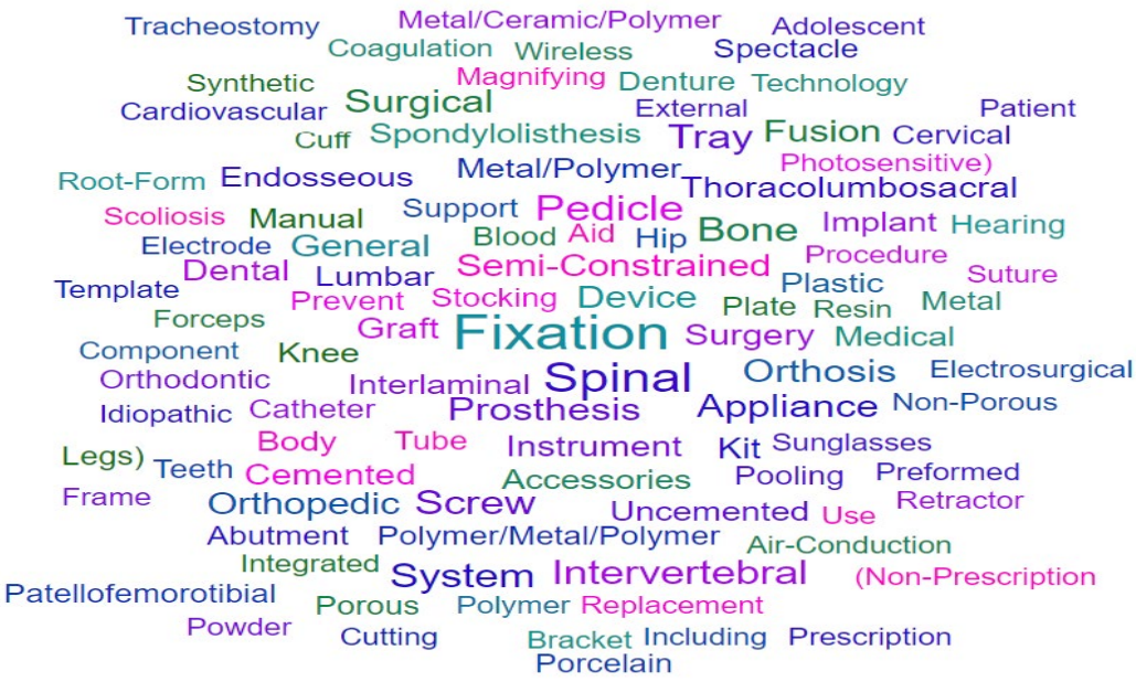 It appears that surgical devices and those used in cardiology are the most common. There is also a high prevalence of terms related to materials like synthetic and plastic, along with terms related to location or application like cervical and tracheostomy.